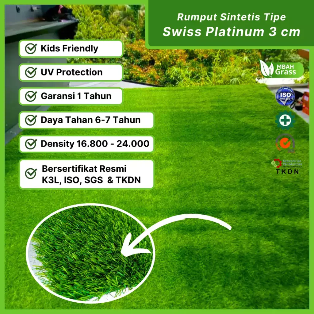 MbahGrass adalah Distributor Rumput Sintetis terbesar di Indonesia. Kami jual rumput sintetis terjangkau yang terjamin kualitasnya. Standar kami kualitas Internasional bersertifikat ISO, FIFA, K3L, TKDN dan ada Garansi Resmi dari kami 2 tahun. Kami melayani pemesanan Partai Besar & Eceran untuk memenuhi kebutuhan dan membantu proyek Anda.